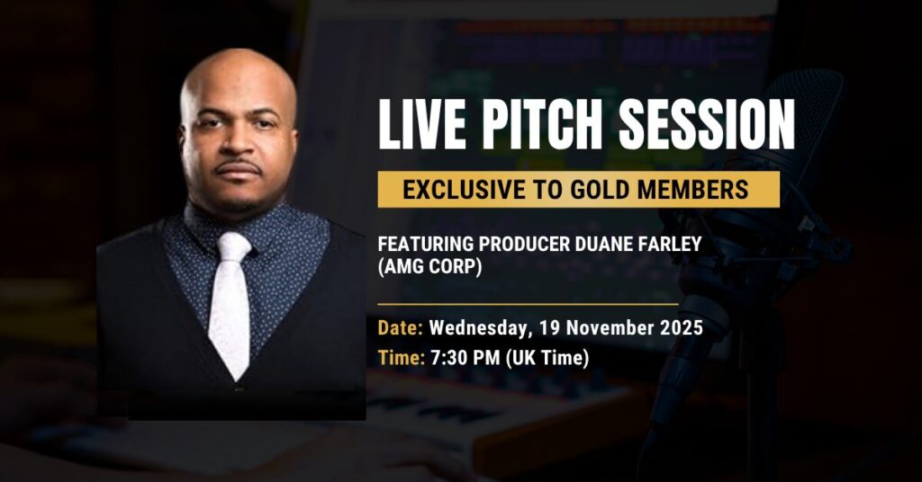 Join us for an exclusive Gold Members–only Live Pitch Session with Duane Farley, acclaimed Producer at AMG Corp. Date: 19 November 2025Time: 7:30 PM (UK Time) Don’t miss this opportunity to connect, learn, and grow your sync potential! Duane FarleyProducer (AMG Corp) As Executive Vice President of The AMG Corp, Duane Farley blends deep industry […]
