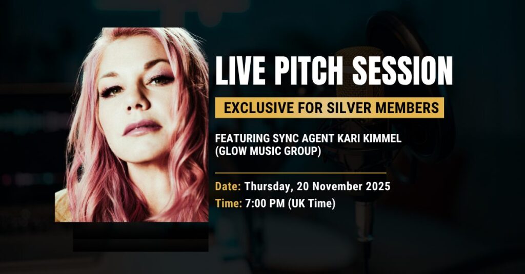 Join us for an exclusive Live Pitch Session with Kari Kimmel, acclaimed Sync Agent and Founder of Glow Music Group. Date: 20 November 2025 Time: 7:00 PM (UK Time) Gain firsthand feedback, insider tips, and the opportunity to have your music heard by one of the industry’s top sync professionals. Don’t miss your chance to […]